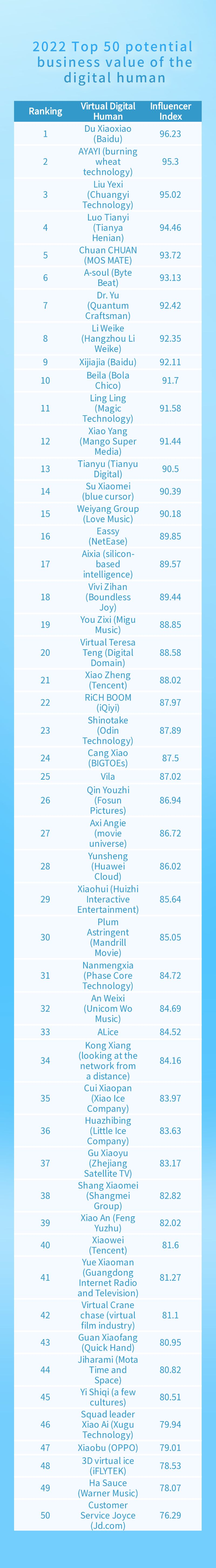 2022 Top 50 potential business value of the digital human:There are more exposure to digital humans in 2022, for example the appearance of digital humans in New Year's Eve, social platforms and even daily services. At present, according to the class...
