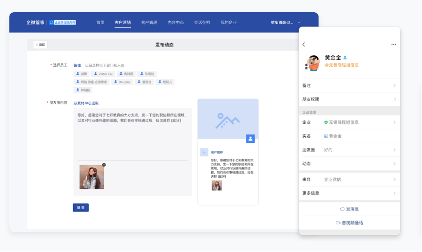 In addition to the "marketing material" applet, EC has also opened up the enterprise WeChat. Through the integrated operation scheme of owned media traffic of EC, it has realized the real-time synchronization of customer data and customer WeChat dynamic track. It can contact WeChat customers with one click, improve user portrait, trace the whole communication track, precipitate customer relations into the company's digital assets, and build a client database, avoiding the loss of customers when employees leave.