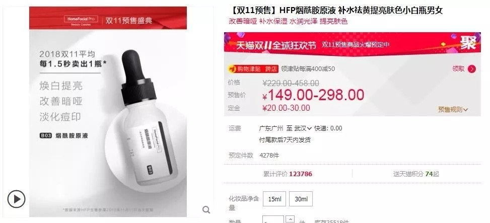 On the other hand, the internet sensation brands or single products that had sprung up before have shown signs of being out-of-date. Last year, in the battle between domestic and international beauty makeup brands, the new ingredient skin-care product HomeFacialPro(HFP) entered the TOP10 list of all-network skin-care cosmetics for the first time, ranking 7th and becoming the strongest dark horse of the 2018 Double Eleven. It is reported that HFP had joined Tmall brand "billion club" in the early morning of that day. However, in 2019 pre-sale, the volume of HFP nicotinamide stock solution, which claims to sell one bottle every 1.5 seconds in 2018, was only 4,278, while the volume of oligopeptide stock solution, which reached an average of 1 bottle per second last year, was 13,000, and the well-received calendula soothing toner and oligosaccharide moisturizing lotion were 17,000 and 16,000 respectively.