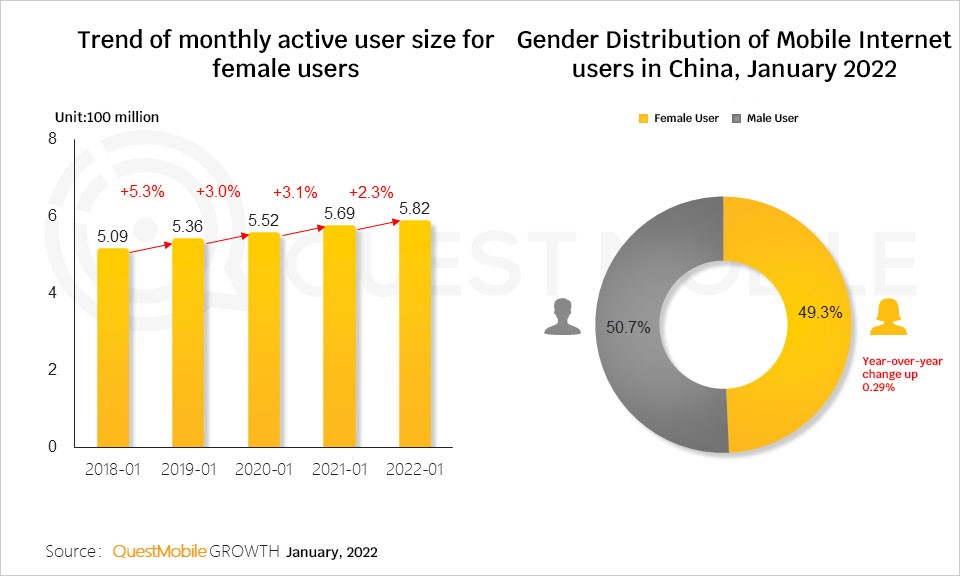 With the rapid development of the mobile Internet, the number of female users has increased year by year. The number of active users has reached 582 million, and the proportion of the entire network has increased to 49.3%. According to QuestMobile data, in January 2022, the average monthly usage time of female users exceeded 170 hours, and the number of APP usage reached 25.6, an increase of 3.1% and 2.6% respectively.