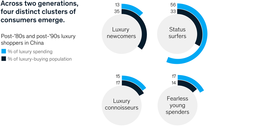 China's wealthy post-80s are driving luxury consumption, and the post-90s generation is a new source of power. There are four distinct groups of buyers among China's post-80s and post-90s. Luxury newcomers care most about brands, while status surfers have the lowest loyalty to brands. They together account for 70% of the young luxury market.